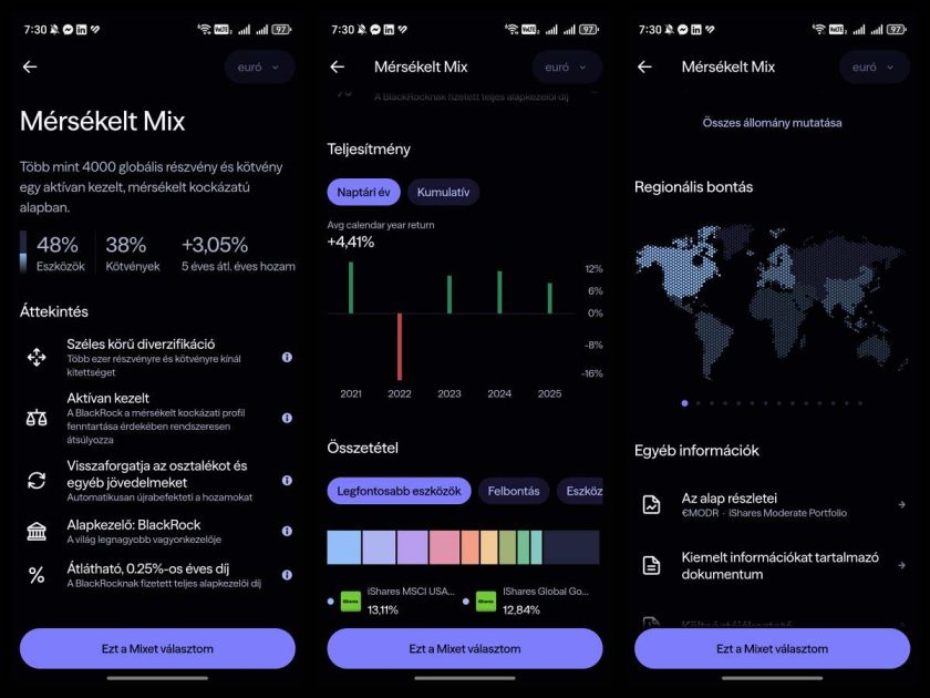 Fontos megjegyezni: az egyszerűség kedvéért a Mixeken belüli ETF összetételét nem tudod módosítani (azok automatikusan teszik a dolgukat a háttérben), cserébe nem is kell mikromenedzselned a portfóliódat.